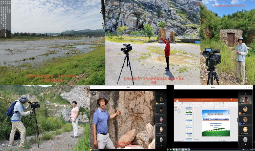2019级水文与水资源工程专业、地下水科学与工程专业共计93名本科生参与本次线上实习培训。为保证线上实习的效果,配备具有十年以上资深实习经验的肖长来、梁秀娟、方樟和冯波老师组成秦皇岛实习队,实习期为期7天,严格执行线上实习方案,白天野外踏勘,摄制地质实习影像,实习期共摄制约30个小时讲解视频和1000余张野外地质现象照片,晚上制作ppt讲解内容,剪辑讲解视频。每天下午6点按照秦皇岛地区主要调查路线及典型地质现象开设2个小时视频会议授课,具体包括秦皇岛野外地质概况、大石河河谷地表水、地下水形成与分布的调查分析;亮甲山奥陶系下同灰岩岩溶裂隙水形成条件与富集规律;东部落寒武系府君山组灰岩岩溶裂隙水形成条件分析;黑山嘴断裂构造低温热水泉的成因分析等内容,指导老师积极组织员工提前预习实习内容,通过腾讯会议、qq及微信等网络平台进行视频与图文生动细致的讲解和答疑,课堂反馈热烈。员工在线学习、提交实习报告,实习指导老师则是在线答疑讲解并评价项目成果。整体来看,线上实习获得了较好的实训效果,为员工兴城野外实习做好理论知识基础准备,这一模式也避免了疫情期间实习对师生可能产生的安全隐患。