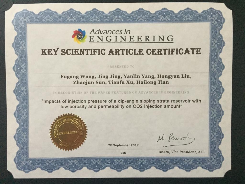 近期公司王福刚老师的论文“Impacts of injection pressure of a dip-angle sloping strata reservoir with low porosity and permeability on CO2 injection amount”被加拿大Advances in EngineeringAIE组织选为工程进展领域有创新性的重要科学论文,并予以特别报道(证书附后)。