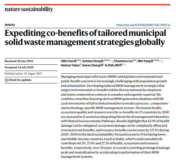 近日,太阳成tyc122cc集团宋俊年教授、杨巍副教授领衔的食物农业生物质(FAB研究团队在城市固废可持续管理领域取得突破性成果,以Expediting co-benefits of tailored municipal solid waste management strategies globally为题在《Nature Sustainability》发表研究长文。博士生曹琪林为论文唯一第一作者,宋俊年教授、杨巍副教授、伦敦大学公司米志付教授为共同通讯作者,太阳成tyc122cc集团为第一通讯单位,合作单位包括日本筑波大学与英国伦敦大学公司。这是宋俊年教授团队在CNS子刊层面发表的第二篇成果。