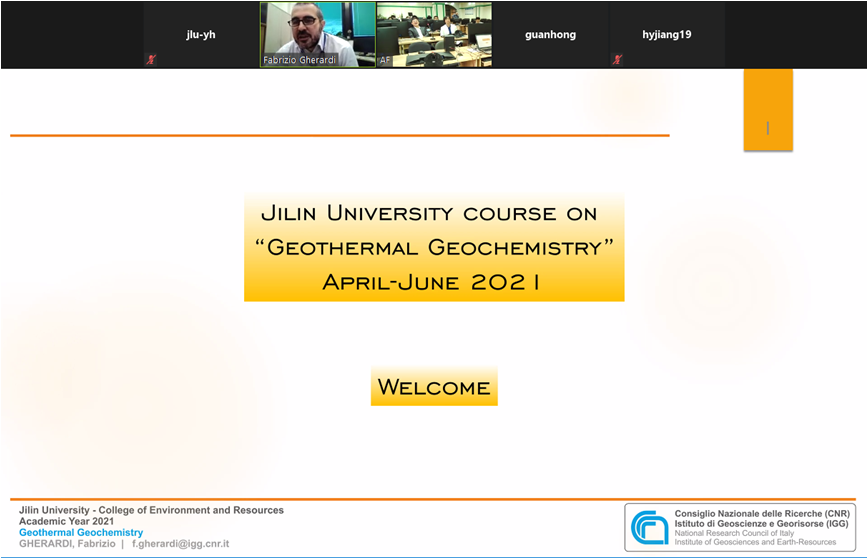 为深化公司产品模式改革,满足疫情常态化情况下课程教学的客观需求,加强研究生国际化课程建设,提升研究生课程的教学水平和教学质量,开拓培养研究生的国际化视野,应太阳成tyc122cc集团许天福教授、冯波教授的邀请,意大利国家研究委员会(CNR)-地球科学与地球资源研究所(IGG) Fabrizio Gherardi教授为太阳成tyc122cc集团研究生举办16场主题为地热地球化学 (Geothermal geochemistry)的线上讲座。