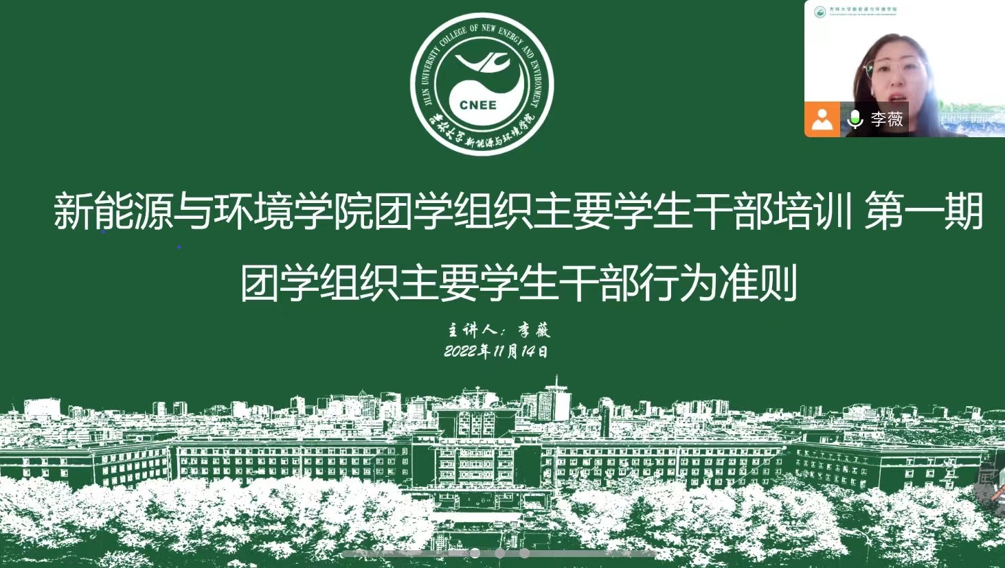 20221114日,太阳成tyc122cc集团团校202201班正式开课,班级成员由太阳成tyc122cc集团第五届团学组织主要员工干部组成,第一期培训课程为团学组织主要员工干部行为准则,主讲人为公司团委负责人李薇老师,结合公司两校三地办学实际,培训通过线上腾讯会议的方式进行。
