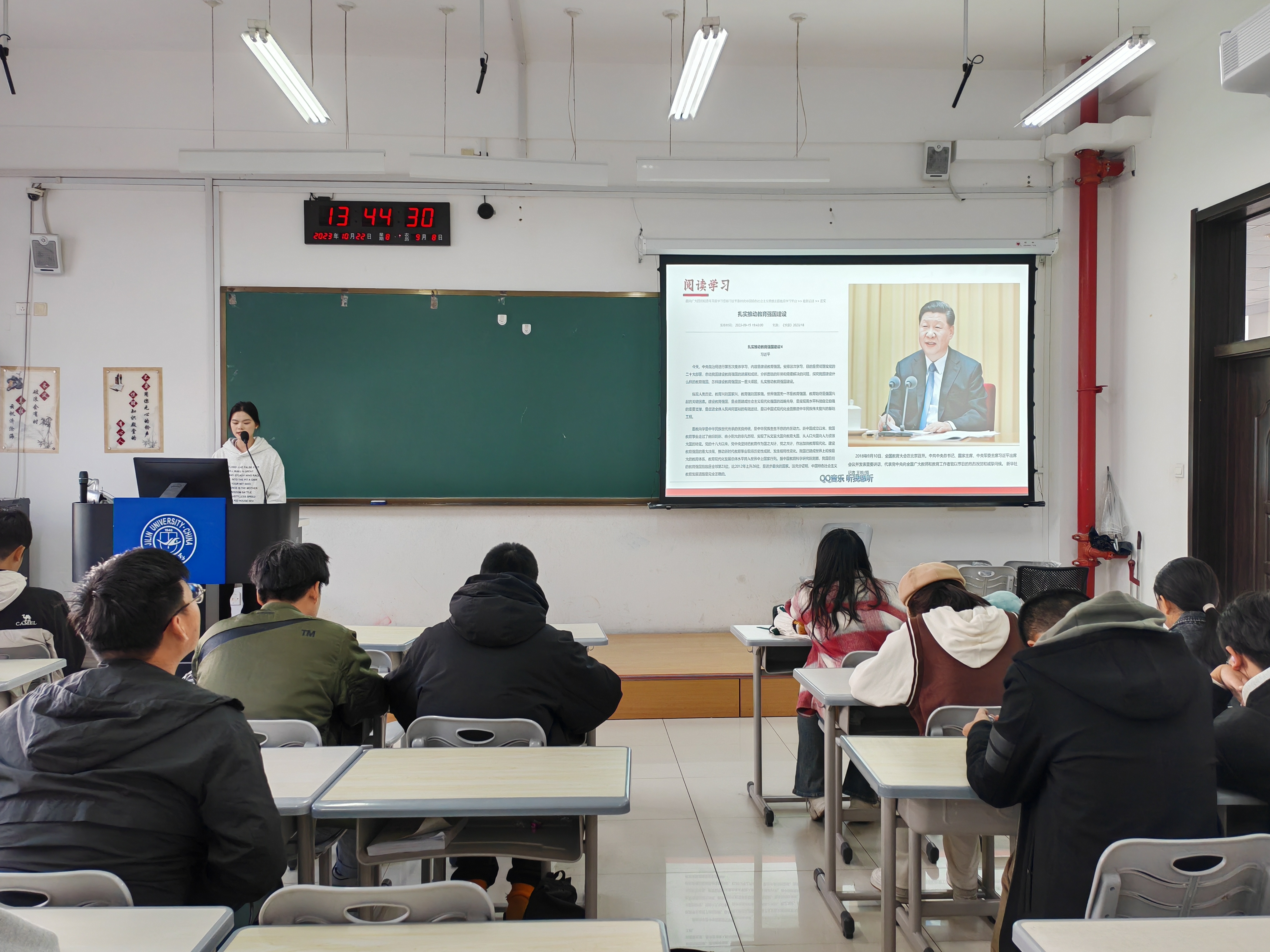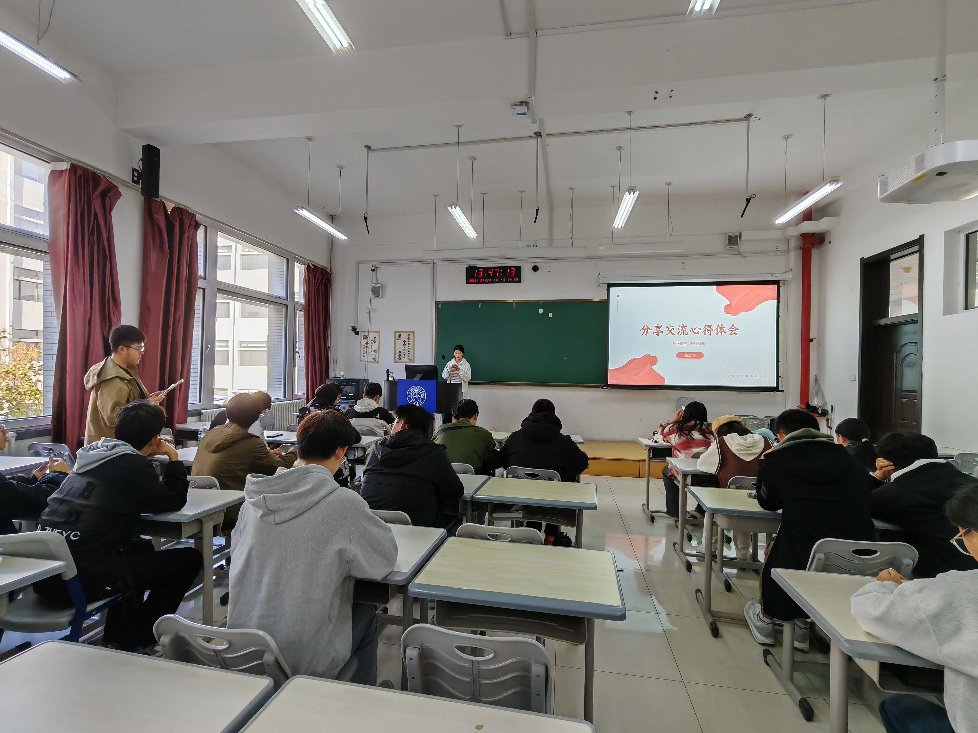 其次,阅读学习完整篇文章之后,同学们互相交流,各抒己见,分享自己的心得体会,同时团支书也为各位同学解疑答惑。其中,赵文硕同学主动与大家分享自己的心得感悟。他认识到:习近平总书记于中央政治局进行的第五次集体学习上将“扎实推动教育强国建设”作为学习重点,可见其紧迫性、时代性、艰巨性和重要性。“百年大计,教育为本”,全党全国各族人民要坚定信心,久久为功,为早日实现教育强国而共同努力。