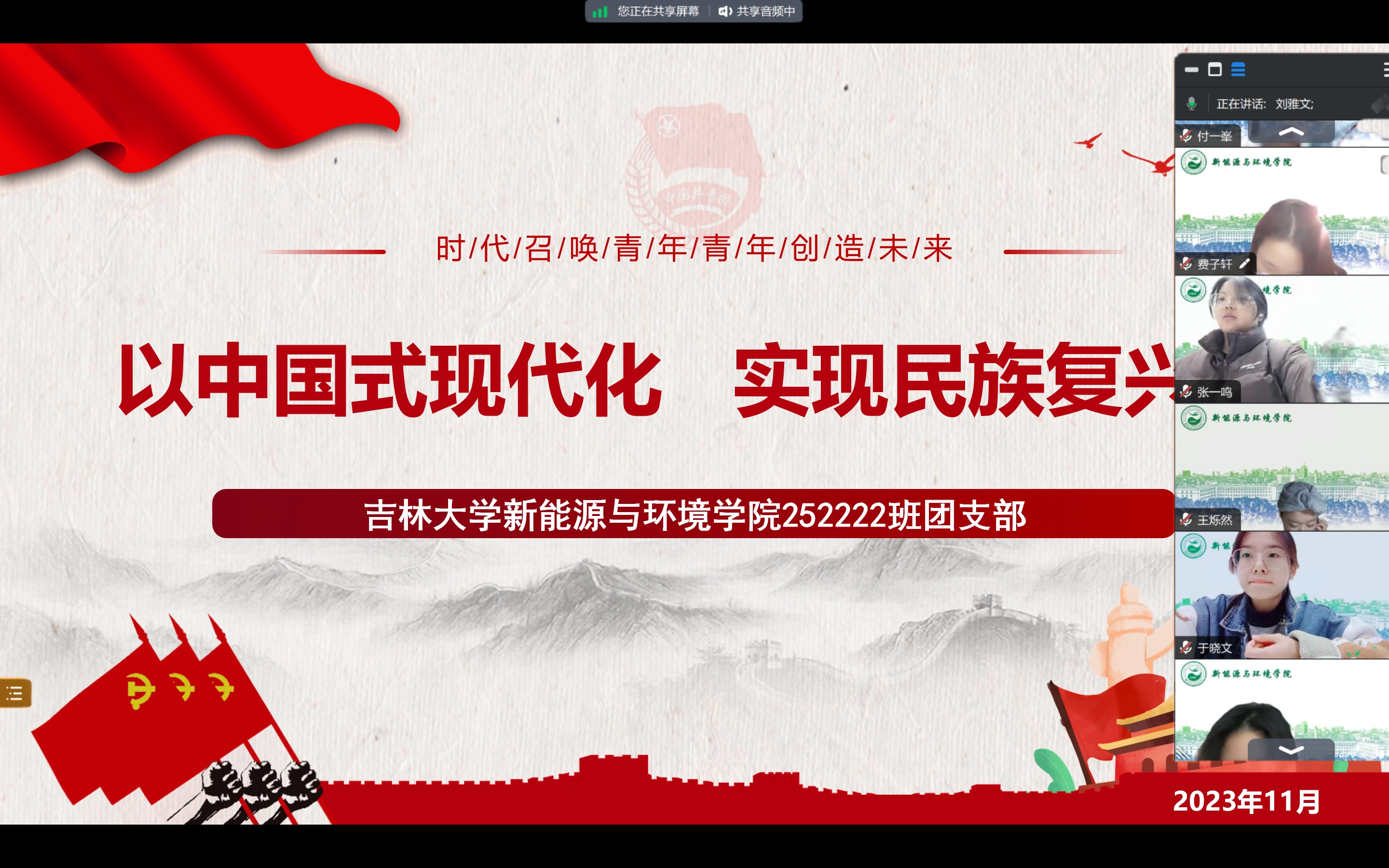 部分班级的团支书以《以中国式现代化实现民族复兴梦》为主要内容,从三个议题展开共同学习和深入探讨——“议题一:寻梦——感知中国梦”“议题二:筑梦——中国式现代化”“议题三:圆梦——强国我担当”。通过共同讨论和学习,同学们深刻认识到:党的十八大以来,习近平总书记鲜明提出实现中华民族伟大复兴的中国梦,特别强调“小康梦、强国梦、中国梦,归根到底是老百姓的‘幸福梦’”,深刻揭示了中国梦的本质要求和价值旨归,充分彰显了中国共产党人的人民立场和政治本色青春逢盛世,奋斗正当时,不辱时代使命,不负人民希望,我们青年,一直在路上。
