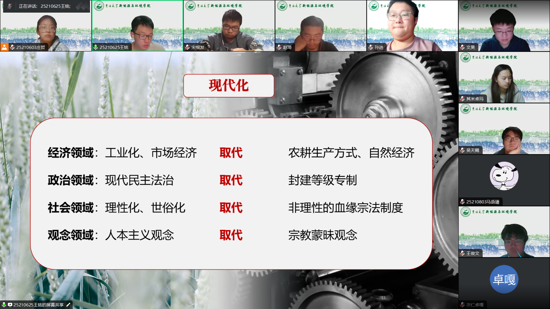 看过视频后,王铭同学为同学们讲解了何为“现代化”,“现代化”这一概念发源于西方,是指社会从农业社会向工业社会转变的历史过程。现代化的概念虽从西方舶来,但不是颠扑不破的真理。我国在进行现代化探索的过程中,既学习西方现代化的先进做法和新鲜经验,又结合我国发展的具体实际,打破了“现代化=西方化”的迷思,逐步走出一条不同于西方模式的、适合中国国情的中国式现代化道路。