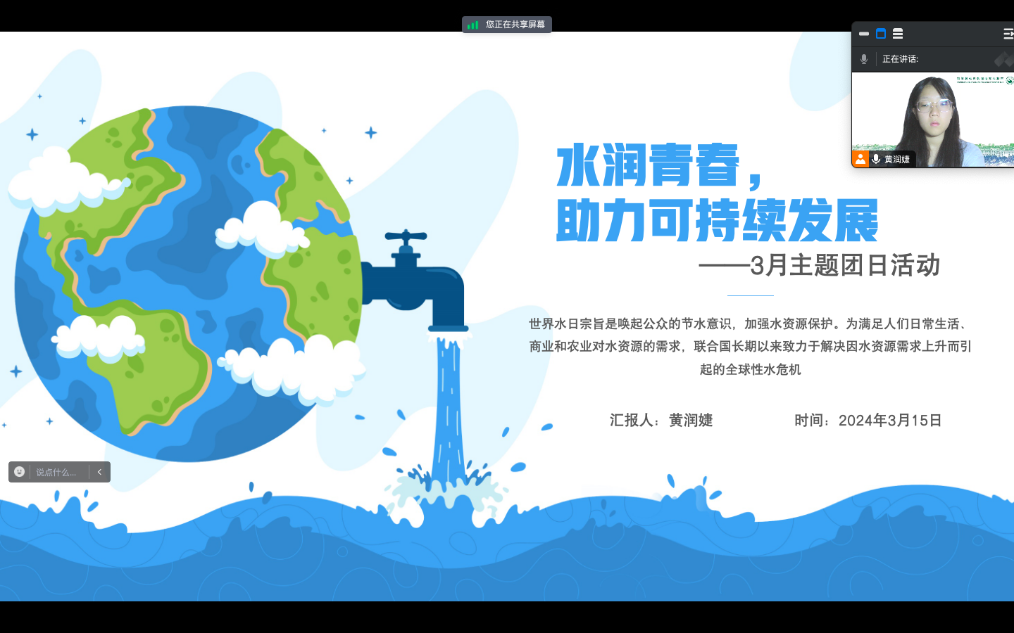 部分团支书带领团支部同学讨论为什么要节约用水,如何节约用水等,阐述节约水资源在中国绿色可持续发展中的重要性。同学们就中国绿色可持续发展的政策已经水资源规划与管理进行了思考与讨论。