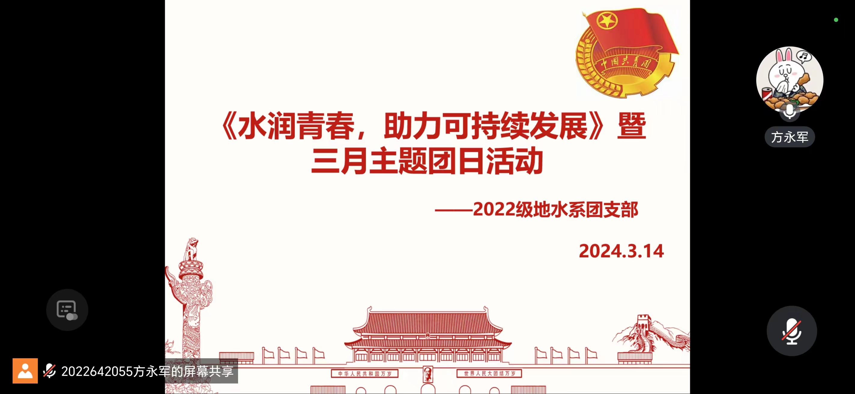首先,团支部书记方永军播放了一则介绍世界水日与中国水周由来的视频。1993年1月18日,第47届联合国大会确定每年3月22日为世界水日,其宗旨是唤起公众的节水意识,加强保护水资源。自1993年“世界水日”确定后,从1994年起,水利部决定将每年“世界水日”即3月22日至3月28日的这一周,确定为“中国水周”,提高全社会关心水、珍惜水、保护水和水忧患意识,促进水资源的开发、利用、保护和管理。支部团员明白了世界水日与中国水周的建立是为了提高公众珍惜和保护水资源的意识。