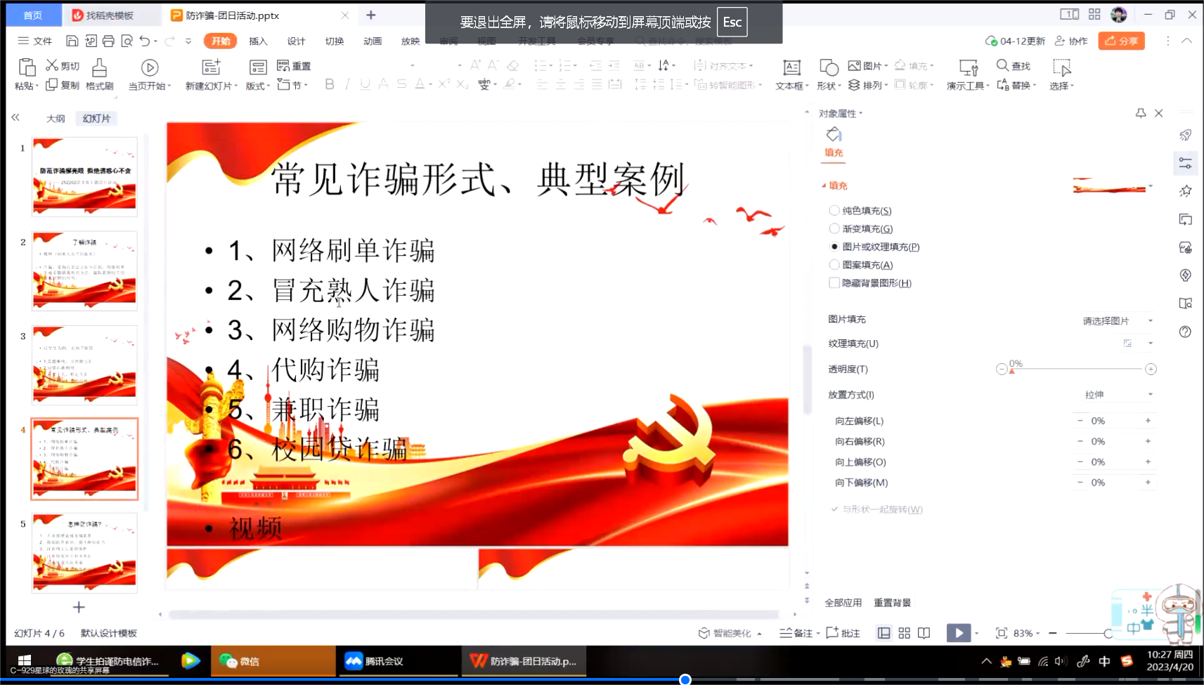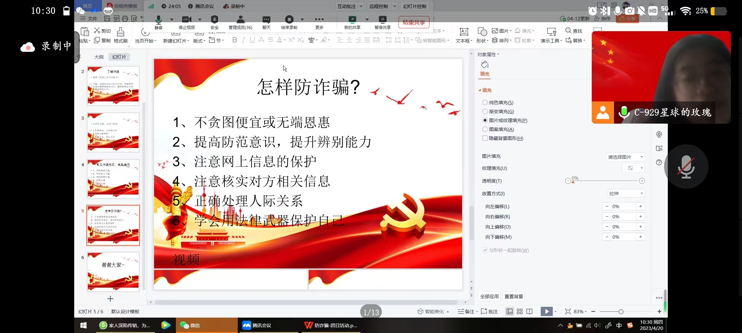 当今社会,电信诈骗案的手段层出不穷。为进一步扩大反诈宣传覆盖面,提高各同学的反诈骗意识、维护大家的财产安全,太阳成tyc122cc集团252202班团支部于4月20日上午十点在团支书郭诗语的带领下,于线上开展“防范诈骗擦亮眼 拒绝诱惑心不贪”反电信网络诈骗宣传教育主题团日活动。本次团日活动共有包括支部内29名共青团员在内的34位青年参加。