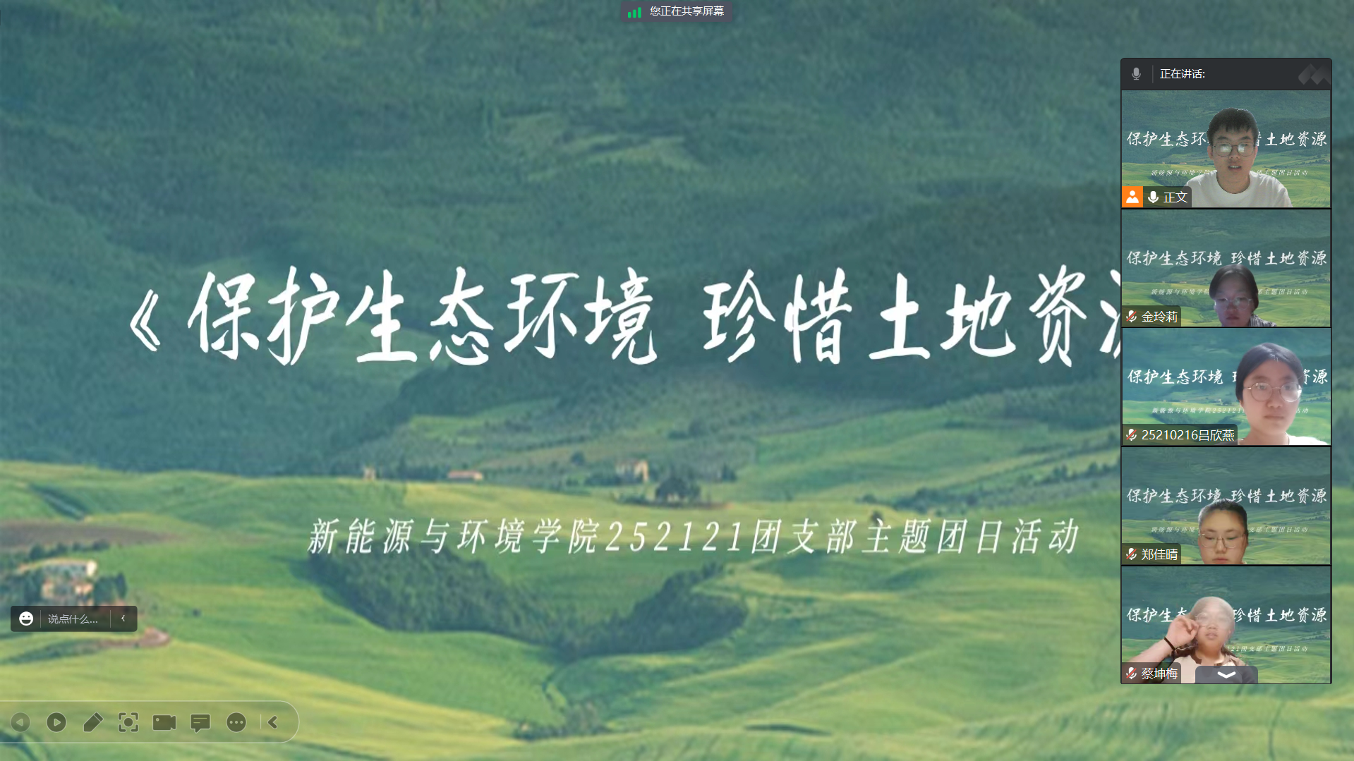 252208班团员李磊磊说:“全球气温升高,水污染,酸雨腐蚀土壤,核污染,土地荒漠化,生物入侵,隐形塑料危机微塑料等环境问题都需要我们加强注意。《寂静的春天》的作者卡逊说过,事情在变得更好之前会变得更糟,如何保护环境应该引起人们的深思。”
