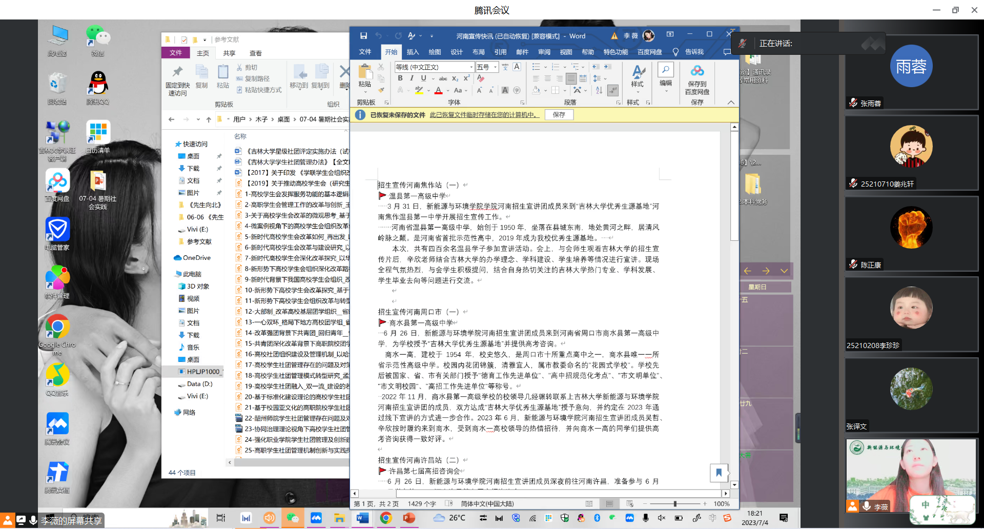 2023年7月4日公司召开2023年暑期社会实践活动动员大会,公司暑期社会实践团队、“返家乡”社会实践成员、“鼎新实习计划”成员参与会议,院团委负责人李薇老师担任主讲人为各位同学解答社会实践注意事项。