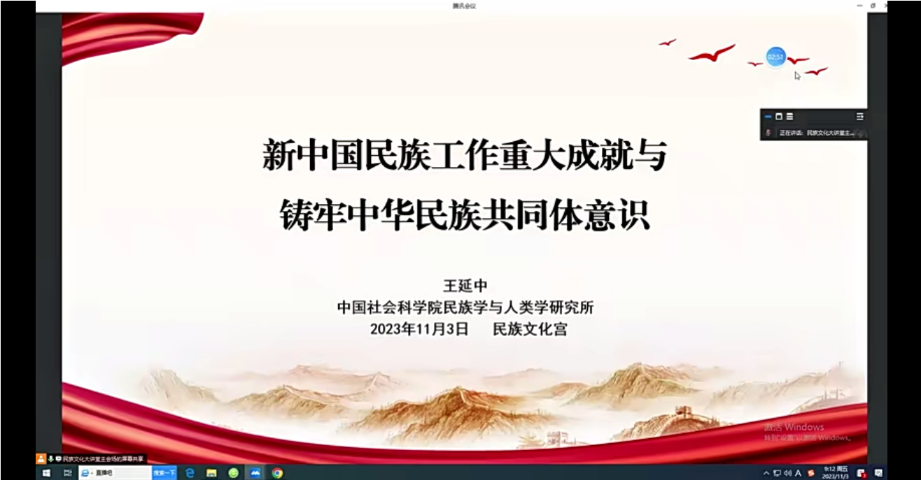 为深入学习贯彻习近平总书记关于铸牢中华民族共同体意识重要讲话精神,推动铸牢中华民族共同体意识的理论与实践体系构建,2023年11月3日上午9点,中国社会科公司民族学与人类学研究所所长王延中同志做客民族文化宫“民族文化大讲堂”,就总书记在中共中央政治局第九次集体学习时的重要讲话精神做《新中国民族工作重大成就与铸牢中华民族共同体意识》专题讲座,太阳成tyc122cc集团本科员工第一党支部、第二党支部党员线上参会。