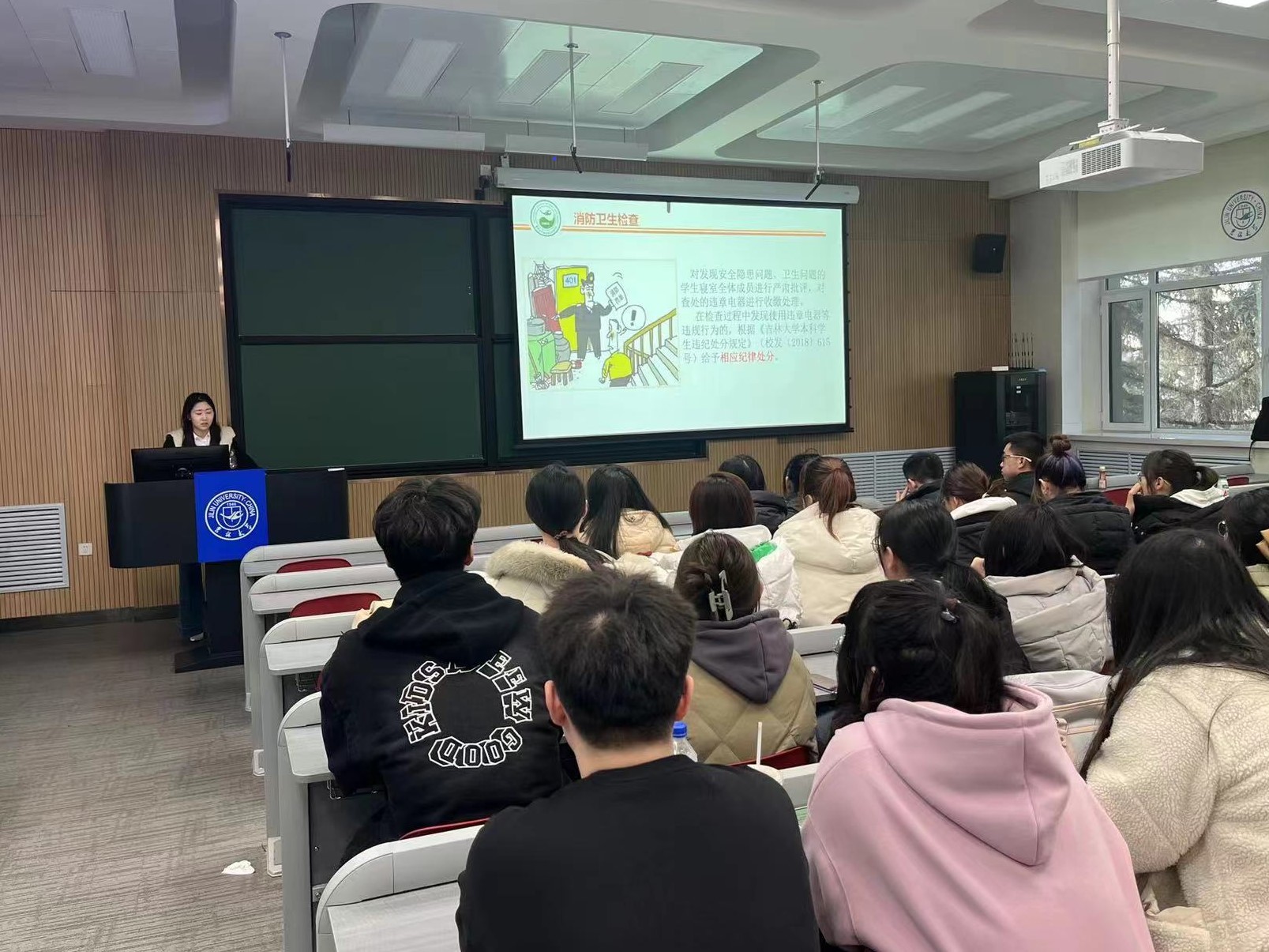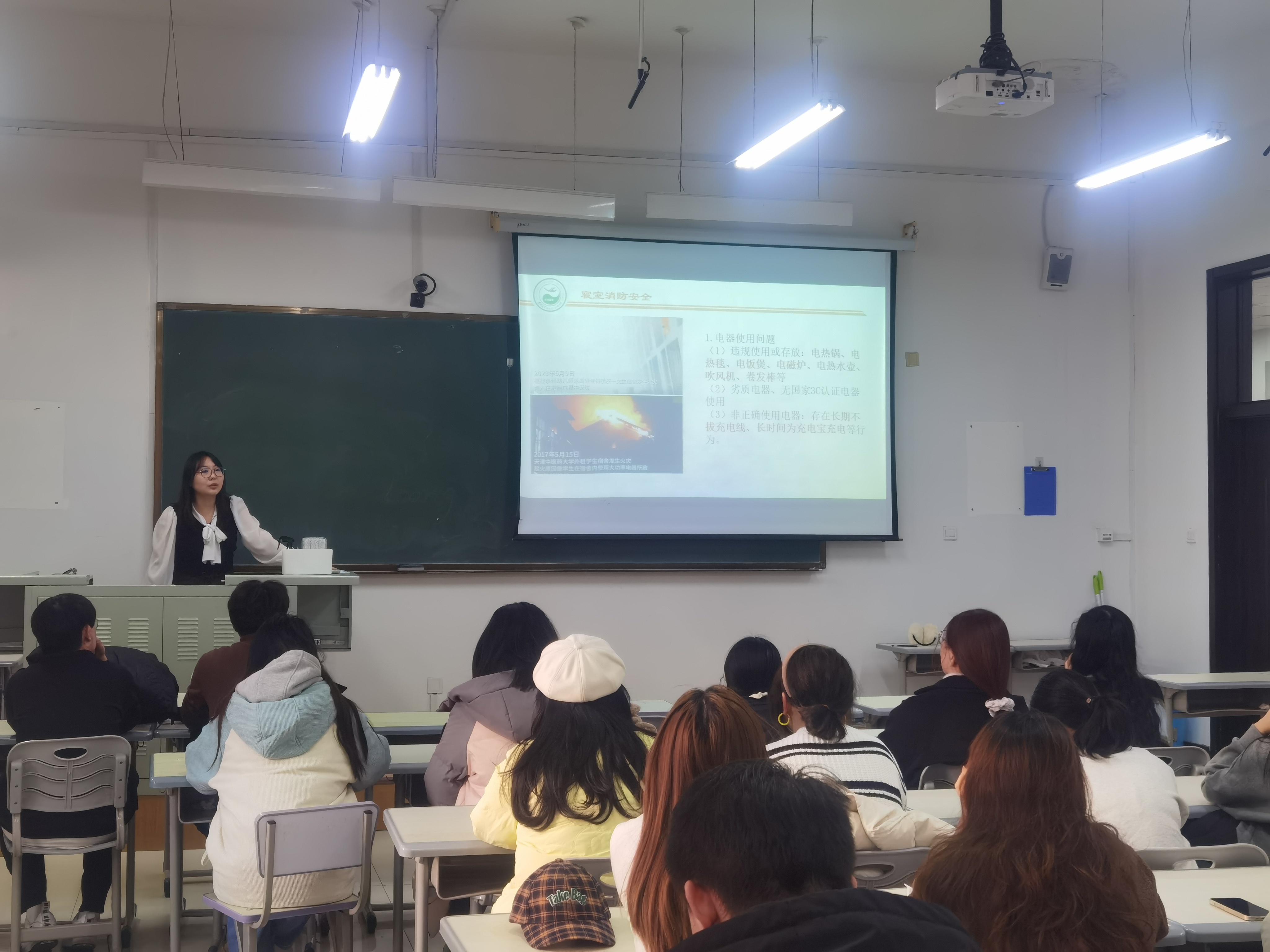 一是消防安全教育。近来,校园消防安全事故频发,给全体师生敲醒警钟。各位老师首先就寝室消防安全问题再次做出强调,对注意电器使用、电动车的使用、明火使用、物品存放、离寝断电等消防安全隐患进行详细解答,提醒同学们关注人身安全,科学防患未“燃”。同时严肃纪律,对寝室安全检查中出现安全隐患问题、卫生问题的员工宿舍进行严肃批评,警示如若在寝室检查过程中发现使用违章电器等违规行为,将缴违规电器并给予相应的纪律处分。