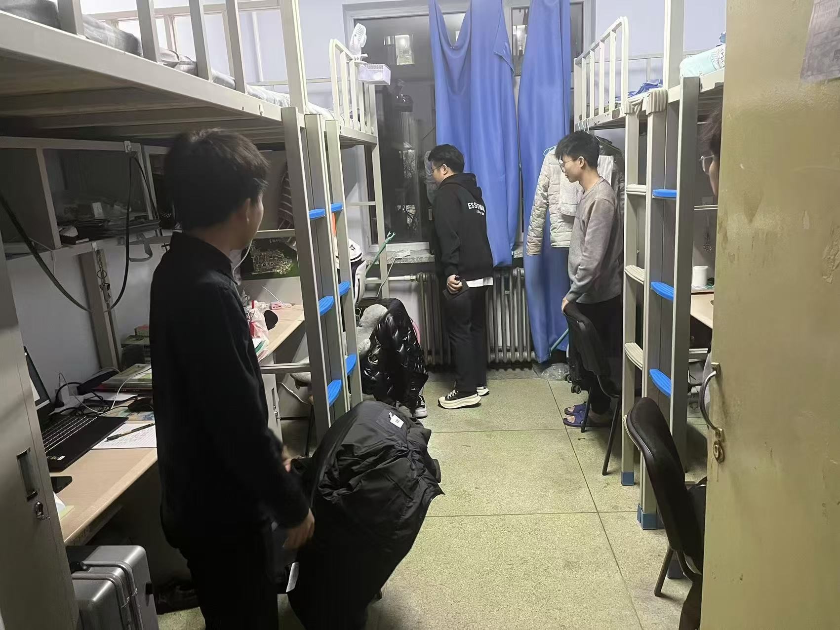 11月4日,2024级新生辅导员助理姜兆轩进入南苑一公寓检查寝室卫生情况,提醒同学们近期气温较低要适当增添衣物注意保暖,并叮嘱同学们认真复习,迎接即将到来的《微积分BI》期中考试。