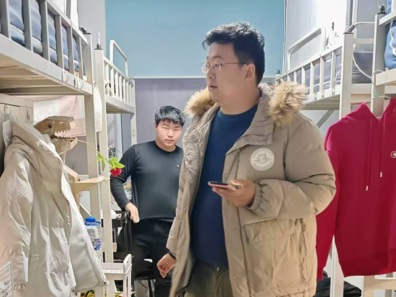 11月12日,2024级新生辅导员助理姜兆轩进入南苑一公寓员工寝室,检查寝室卫生和消防安全,提醒员工定期整理寝室内务,整齐摆放个人物品。