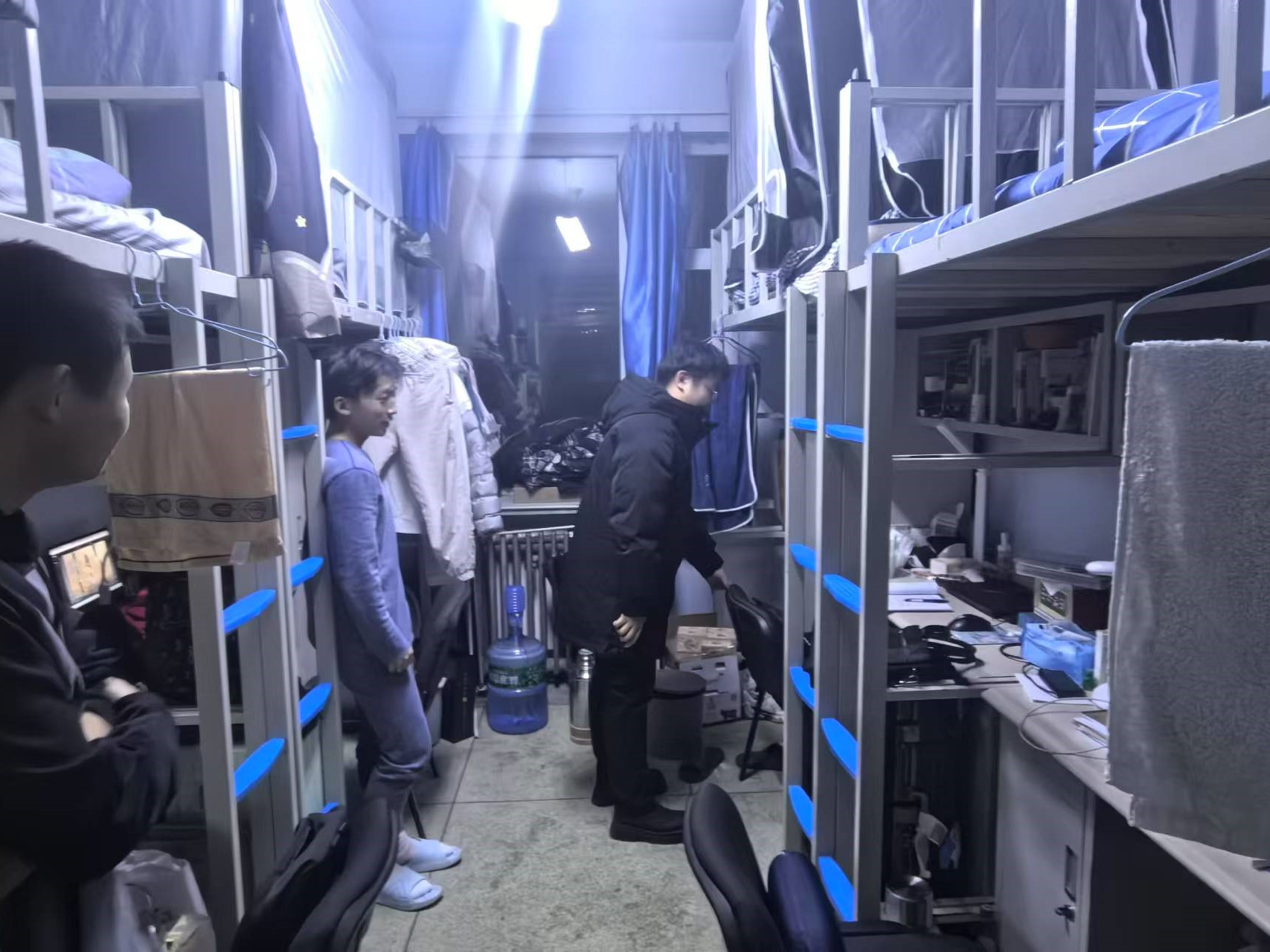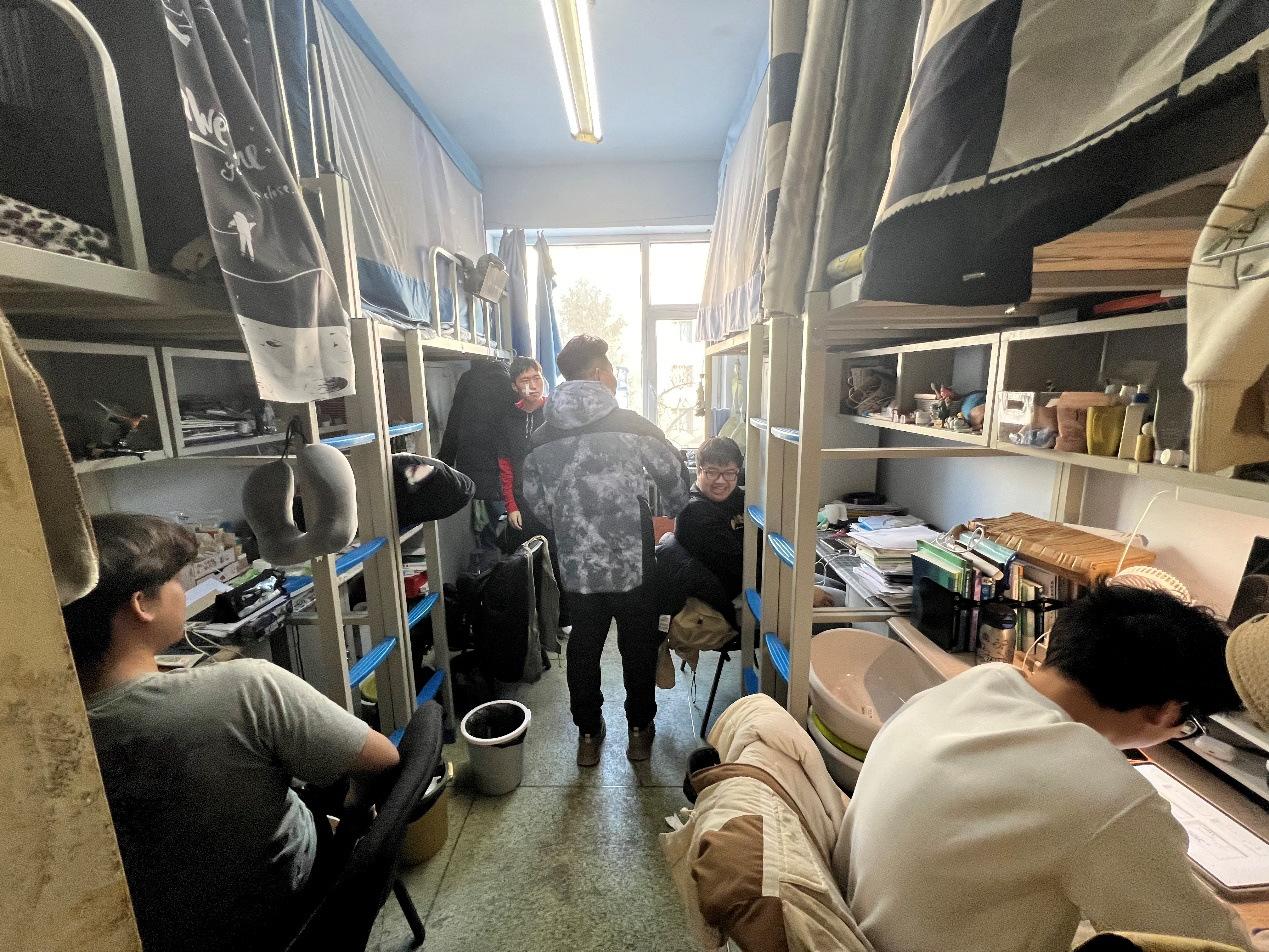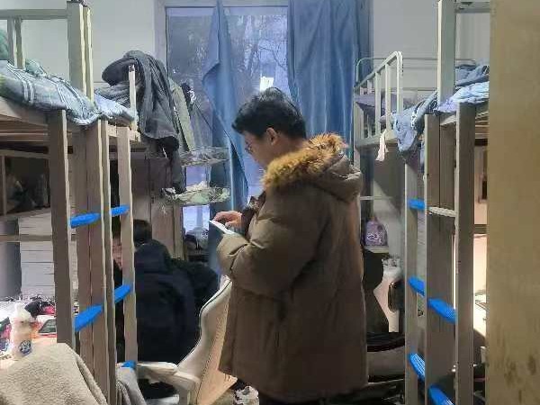 12月13日,2024级新生辅导员助理姜兆轩进入南苑一公寓员工寝室,实地了解寝室供暖情况,提醒同学们近期早晚温差较大要注意增添衣物,并开始有序进行各科课程的期末复习。