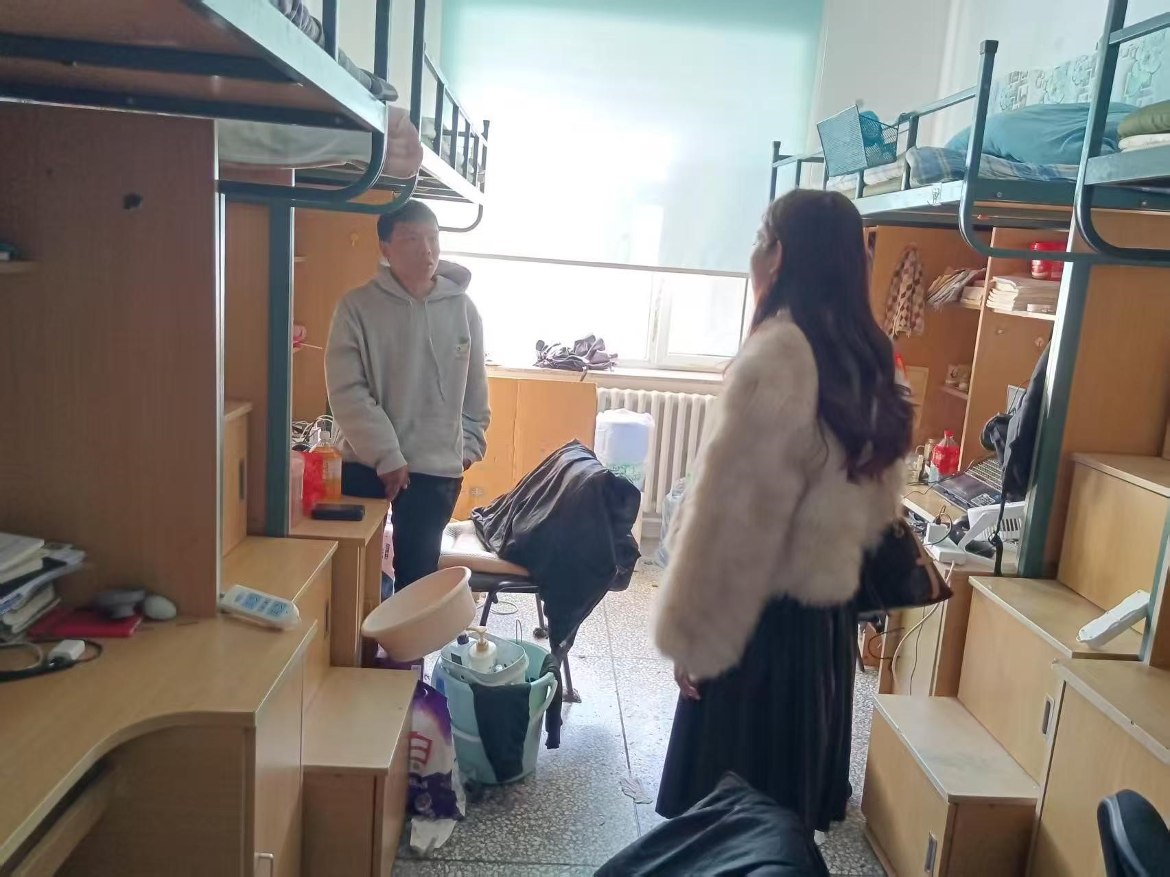 2月24日,2021级辅导员李薇老师进入朝阳五公寓、朝阳七公寓员工对员工考研初试情况进行摸排,对寝室卫生、消防安全进行检查。