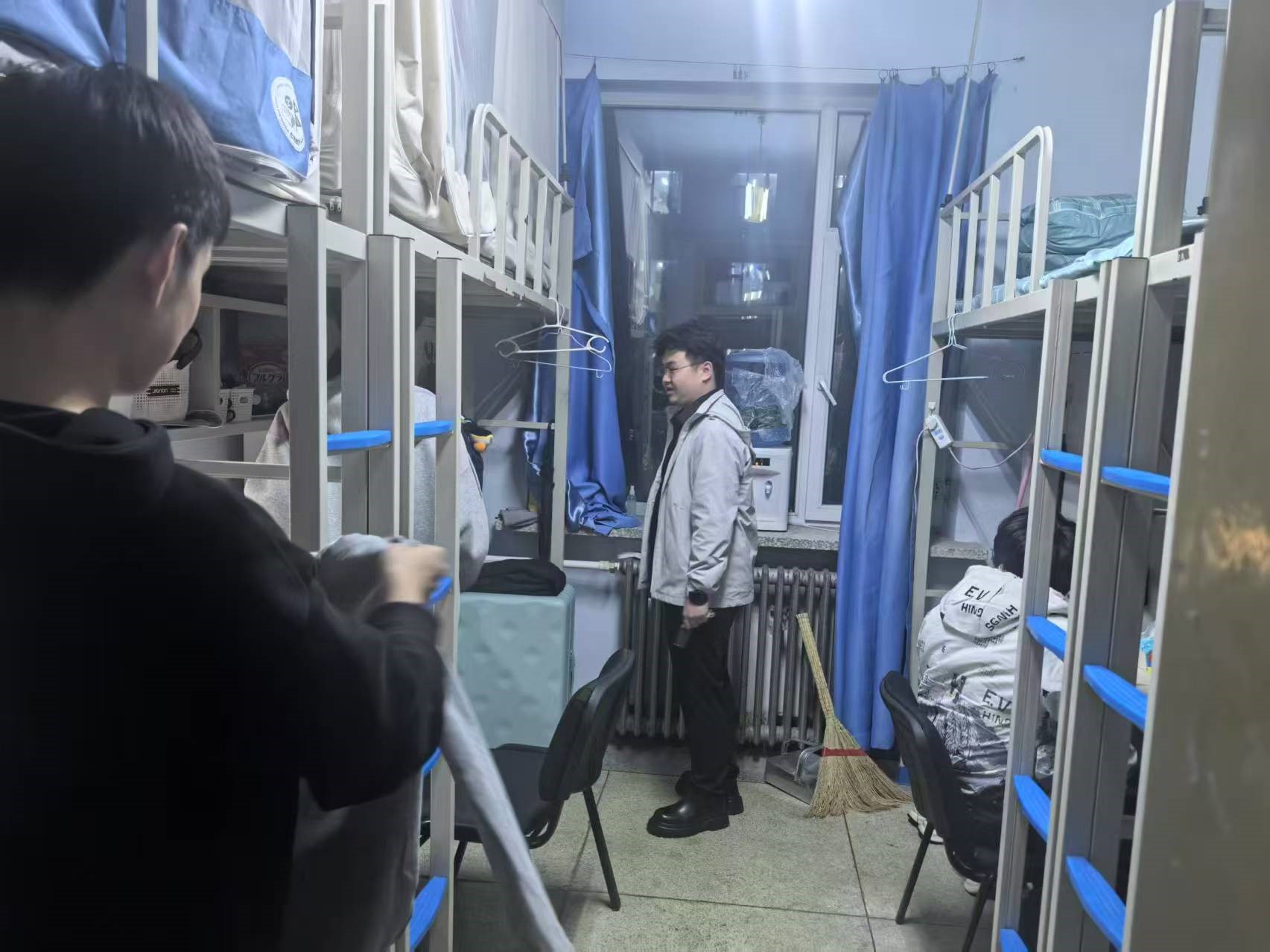 4月9日,2024级新生辅导员助理姜兆轩进入南苑一公寓对寝室卫生情况进行检查,同时查看转出员工空余床位情况。