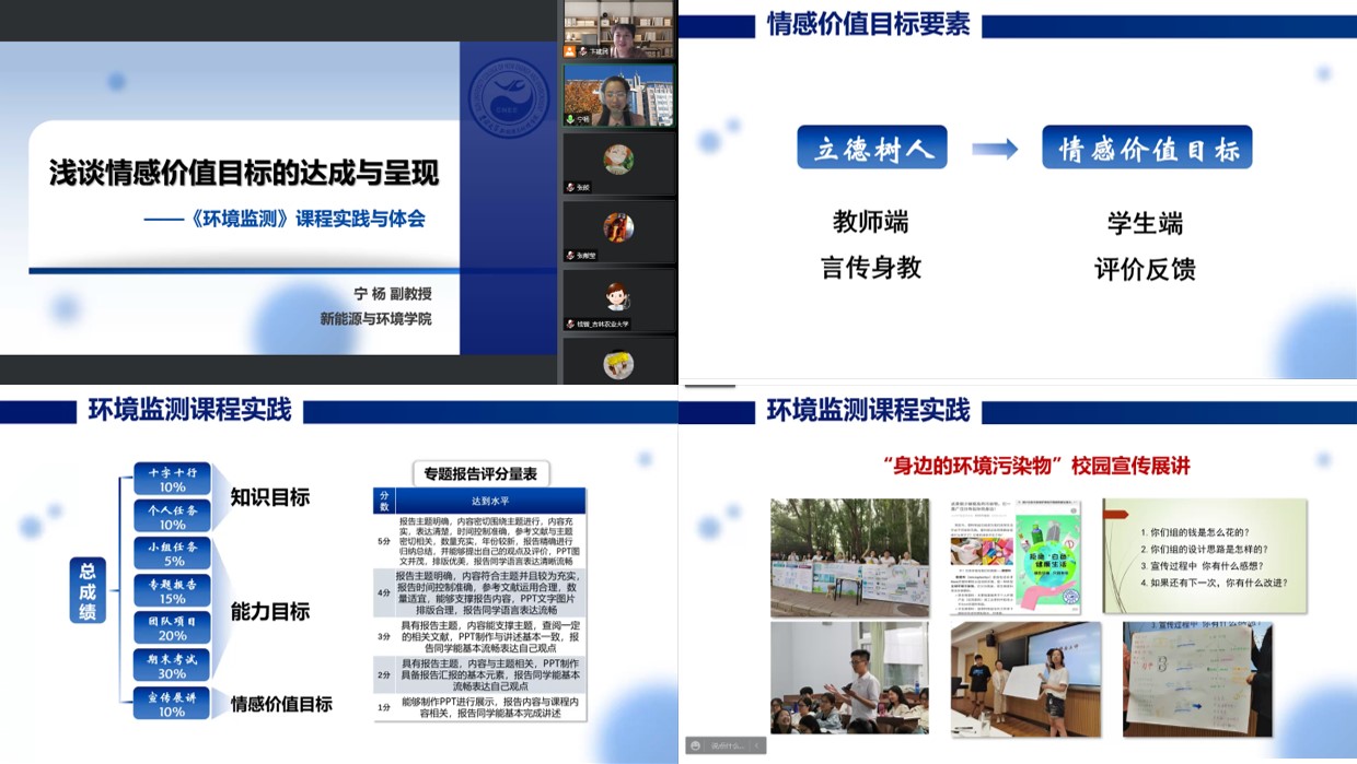 宁杨老师分析了情感价值目标的特点,并介绍了她在环境监测课程中的教学实践。宁老师指出,情感价值目标应同知识、能力等教学目标一样,具有可达成、可测量的要素,并必须依托员工的学习行为进行评价和反馈。她介绍了环境监测课程中采用的PPT汇报、实践反思活动、评教问卷调研、课间主题讨论等多种情感价值目标达成的呈现形式,并以此为基础提出了情感价值目标呈现方式的设计原则。宁老师的报告内容为公司教师进行课程情感价值目标撰写和相应教学活动的设计提供了重要参考和指导思路。