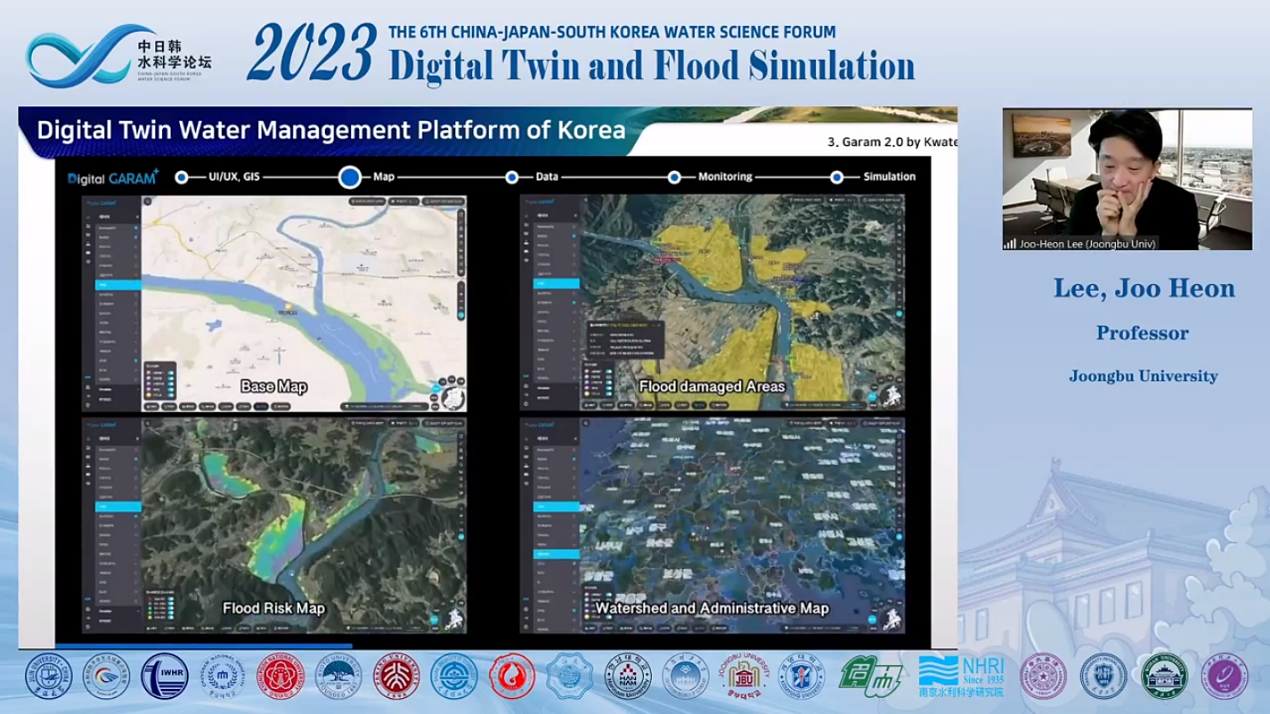 论坛首先由经理许天福教授致欢迎词,王浩院士作为学术委员会主席阐述了中日韩科学家开展深入交流和探讨的重要意义,指出“中日韩三国同属季风气候区,降雨时空分布不均,汛期雨量集中,长期遭受严重洪涝灾害,近年来,在气候变化影响下,极端暴雨频发,洪涝灾害加剧,进一步加强数字孪生与洪涝模拟相关科学研究十分必要”。王院士希望各国科学家贡献智慧、互学互鉴、促进交流、加强合作,为建设美好、宜居的地球家园和构建人类命运共同体贡献科技力量。线下会议由李鸿雁教授主持,线上会议由冯右骖副教授主持。