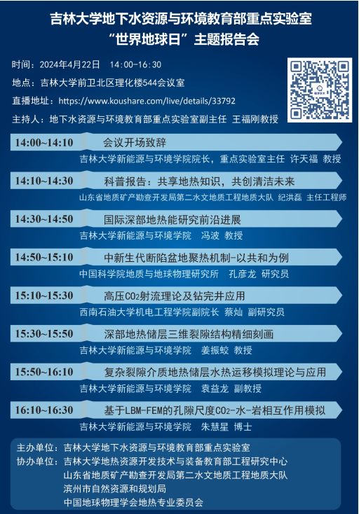 2024年4月22日是第55个“世界地球日”,主题为“全球战塑”(Planet vs. Plastics)。今年的世界地球日主题报告会活动由“地下水资源与环境教育部重点实验室主办,太阳成tyc122cc集团地热资源开发技术与装备教育部工程研究中心、山东省地质矿产勘查开发局第二水文地质工程地质大队、滨州市自然资源和规划局、中国地球物理学会地热专业委员会联合协办”,蔻享学术网络平台提供直博服务。报告主题围绕应对全球气候变化的国际关注热点问题,分别从绿色能源-地热能开发,以及二氧化碳减排地质封存两方面进行科普宣讲和学术研讨。会议由地下水资源与环境教育部重点实验室副主任王福刚教授主持,重点实验室成员及研究生50余人线下参加此次学术交流活动,6000余人通过“蔻享学术”平台直播观看了此次报告会。