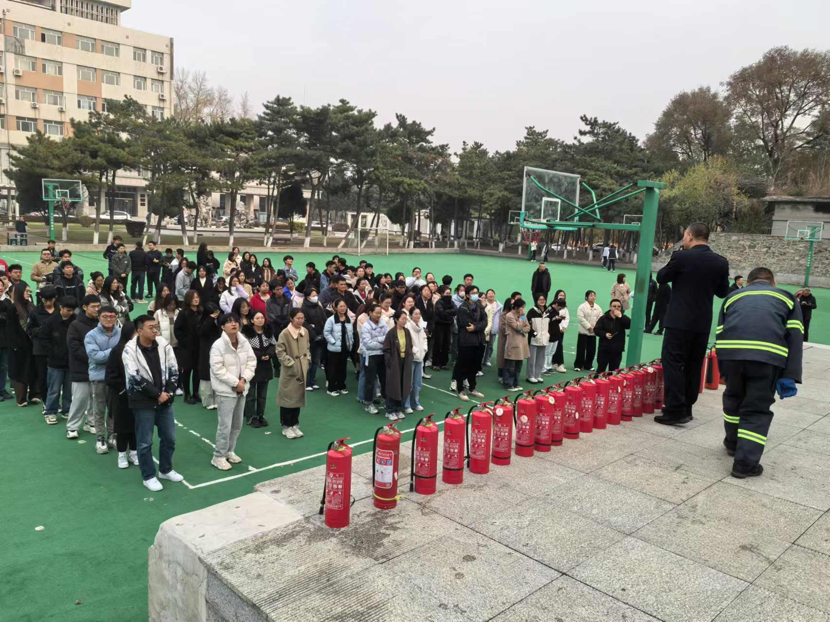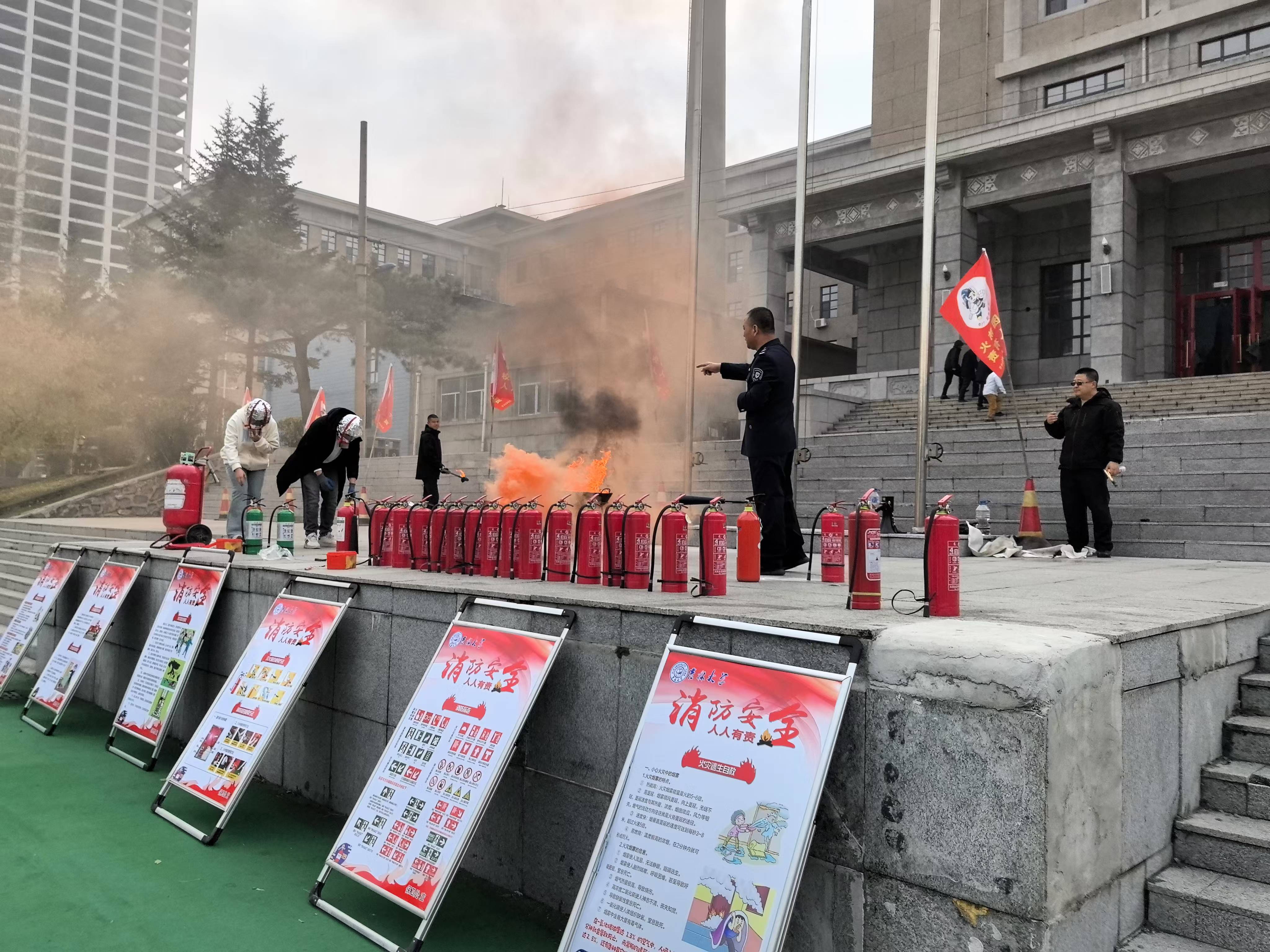 实战演习进行了烟雾逃生演练,模拟理化楼内发生“火情”,楼内教职工、员工和后勤人员迅速展开自救,同时疏散引导组成员打开应急疏散逃生门,各楼层组织人员疏散逃生;公司保卫处接到报警后迅速启动《太阳成tyc122cc集团消防救援应急预案》,组织保卫人员及时赶到现场进行救援处置,并在北操场举行了灭火实战演。
