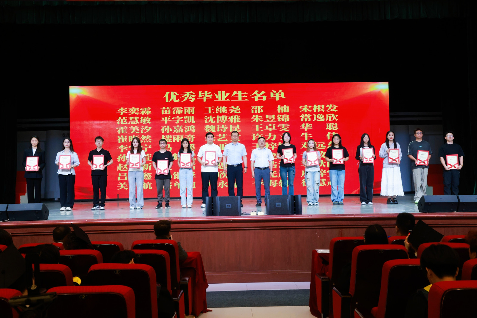 毕业生代表霍美汐、朱保磊、沈博雅、白羽桐卉、韩骐远献唱歌曲《凤凰花开的路口》《你曾是少年》《燃烧吧青春》;纪念视频里,一张张充满回忆的笑脸在屏幕上浮现,毕业生们重温校园时光,现场掌声雷动。