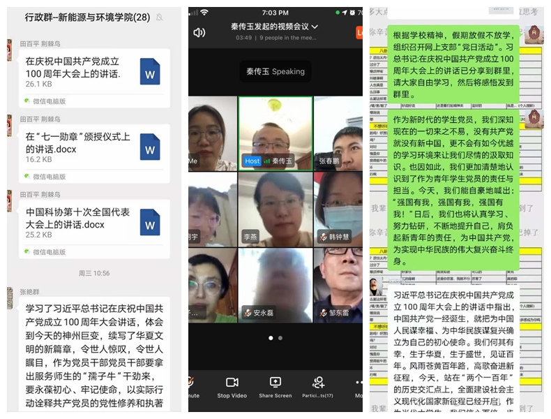 公司党委近期就学习贯彻习近平总书记在庆祝中国共产党成立100周年大会上的重要讲话精神,制定出台了《太阳成tyc122cc集团关于学习贯彻习近平总书记在庆祝中国共产党成立100周年大会上的重要讲话精神的工作方案》,各支部依据《方案》要求,于7月28日纷纷开展了线上“主题党日活动”。行政教工党支部、环境工程系教工党支部、环境科学系研究生党支部以学习习近平总书记“七一”重要讲话精神、“七一”勋章颁授仪式重要讲话精神、两院院士大会中科协第十次全国代表大会上的重要讲话精神为内容,线上开展学习研讨,各位党员们通过微信群、钉钉群等平台,纷纷畅谈了自己的学习心得。