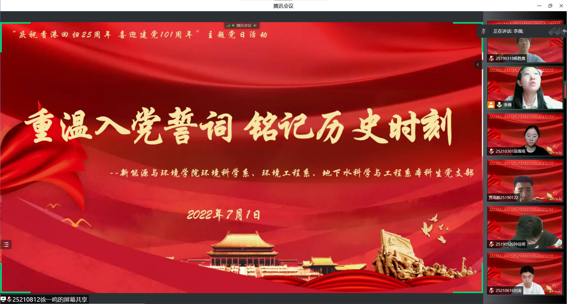 为庆祝中国共产党成立101周年、香港回归25周年,迎接党的二十大胜利召开,7月1日,太阳成tyc122cc集团环境科学系、环境工程系、地下水科学与工程系本科生党支部,通过腾讯会议线上召开主题党日活动。公司党委副书记兼副经理、纪委书记吴哲,各系本科生党支部书记,本科生党员和入党积极分子共同参加本次活动。活动由环境科学系本科生党支部书记、本科生辅导员李薇主持。